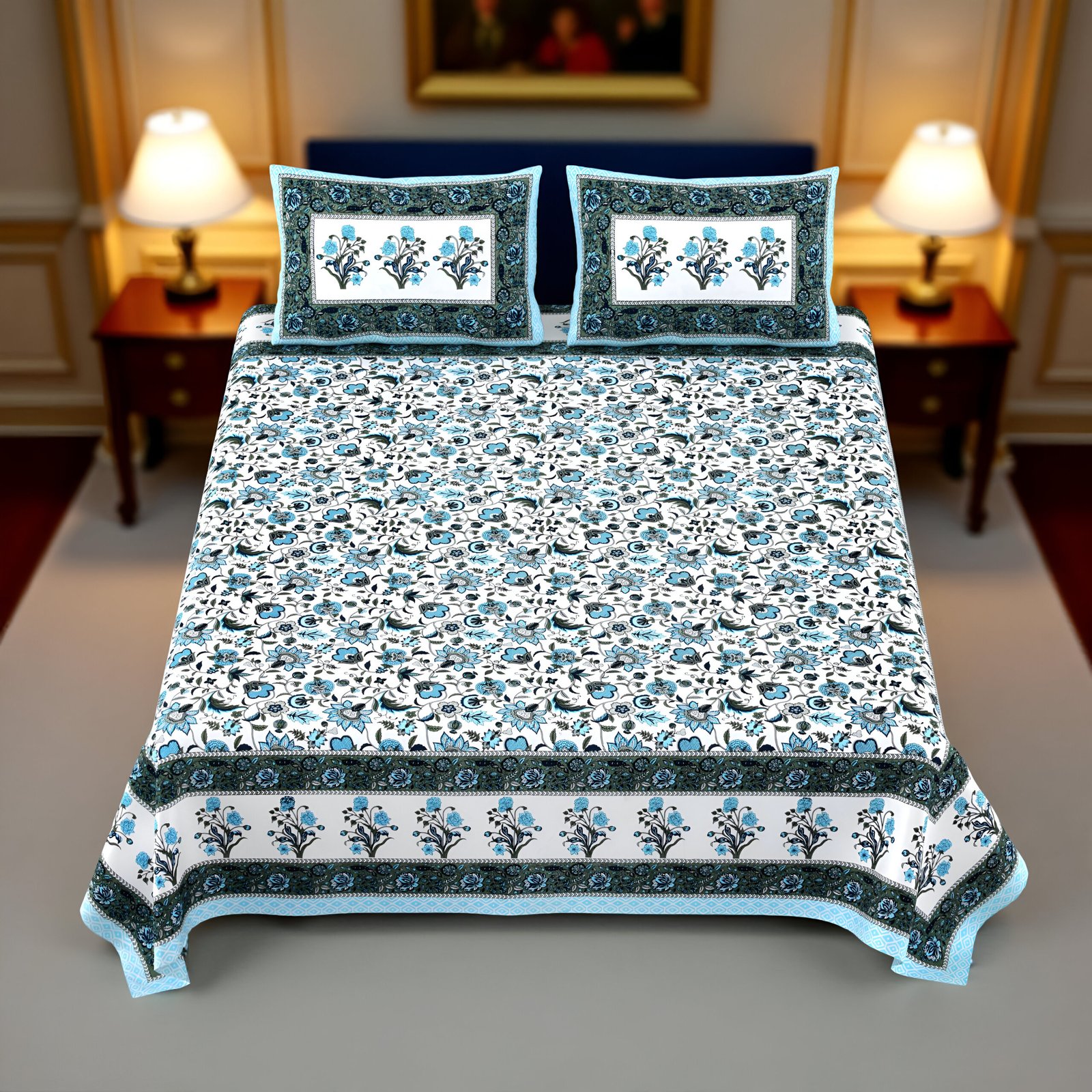 Bring home the refreshing charm of the Blue Breeze Bedsheet, crafted in premium 210 thread count cotton for unmatched softness and durability. The elegant blue floral print paired with a rich border design adds a calming yet vibrant touch to your bedroom décor. Perfect for a king-size bed, this 108×108 bedsheet offers full coverage and includes two matching pillow covers for a complete look.