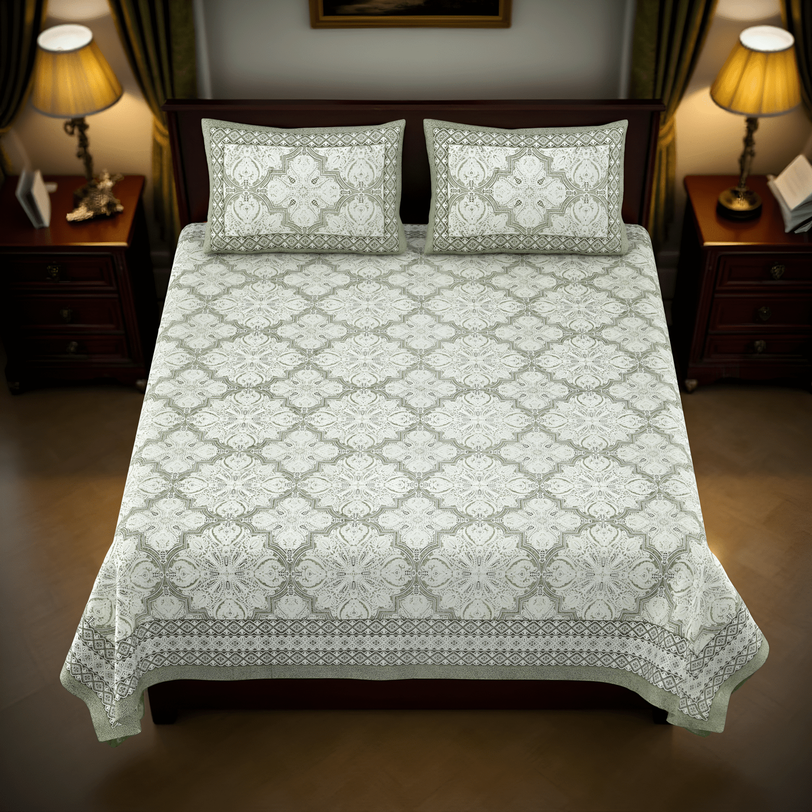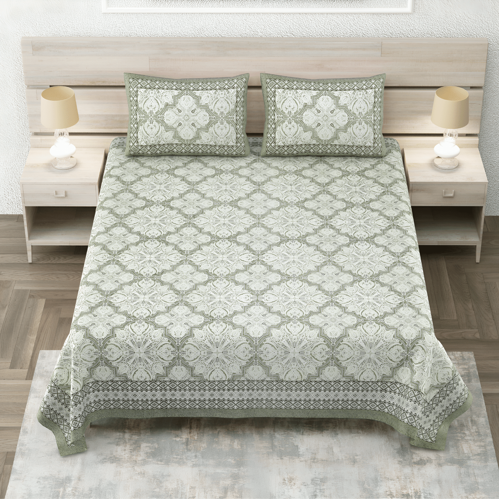 Bring home a serene touch of elegance with the Olive Charm Bedsheet. Designed with intricate symmetrical patterns in soothing olive green tones, this 210 TC cotton bedsheet offers both style and supreme comfort. Perfect for enhancing your bedroom’s classic charm while ensuring a restful night.