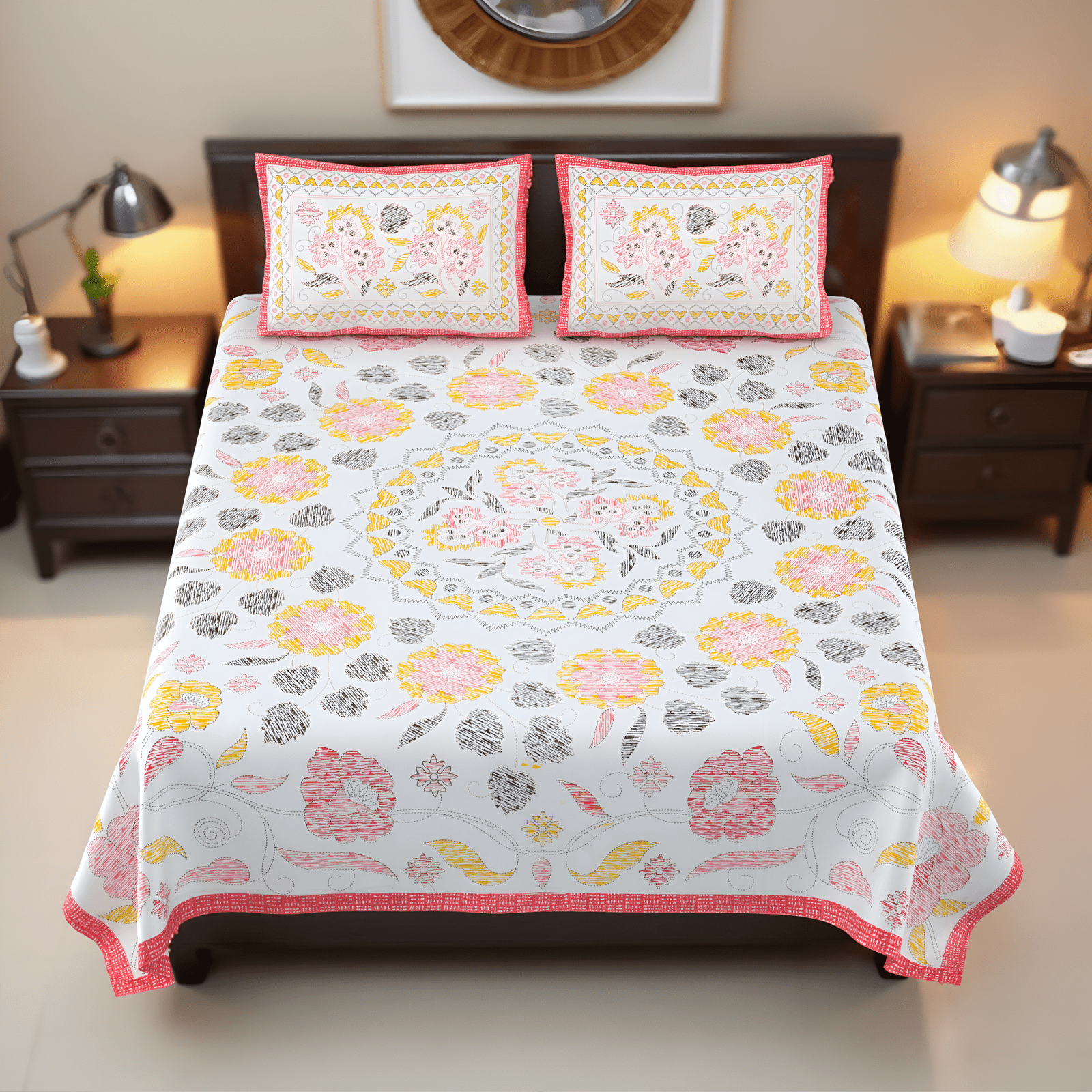 Add a pop of floral freshness to your bedroom with the Sunburst Bloom Bedsheet. Made from premium 210 TC cotton, this bedsheet ensures a soft, breathable, and comfortable sleeping experience. The vibrant yellow, pink, and grey floral pattern brings a cheerful and elegant charm to your space.