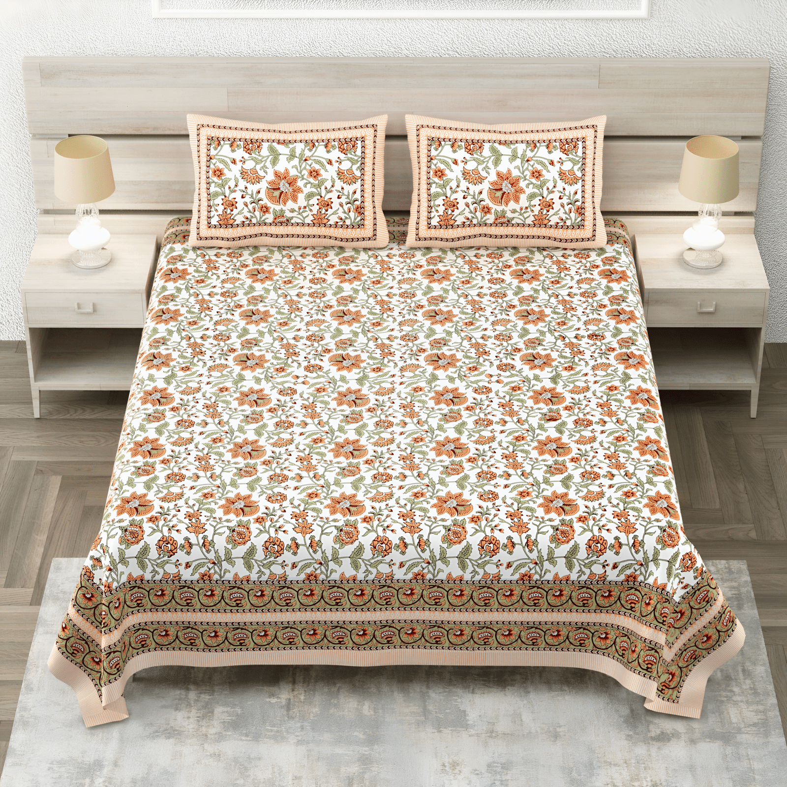 Bring home the timeless beauty of blooming saffron gardens with the Zafran Garden Bedsheet. Featuring a rich floral pattern in warm earthy tones of saffron orange and olive green, this bedsheet adds a vibrant yet elegant touch to your bedroom. Made from soft and breathable 210 TC cotton, it ensures comfort all night long while enhancing your space with traditional charm.